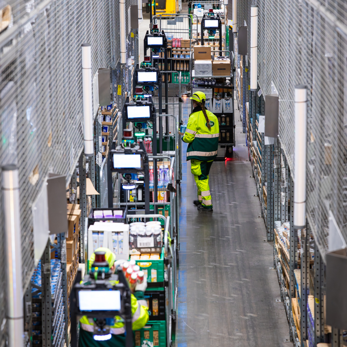 Pickers can pick from any nearby roll cage or pallet within their zone. If the next pick is close, they continue with the same load carrier. If demand shifts, they are guided to another pick location where another Lowpad AMR is already positioned. This creates density, reduces idle time and keeps picking flows moving.