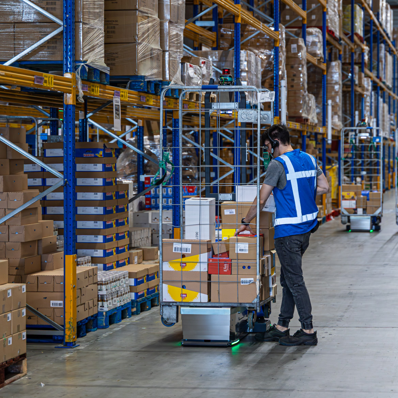 Pickers can pick from any nearby roll cage or pallet within their zone. If the next pick is close, they continue with the same load carrier. If demand shifts, they are guided to another pick location where another Lowpad AMR is already positioned. This creates density, reduces idle time and keeps picking flows moving.